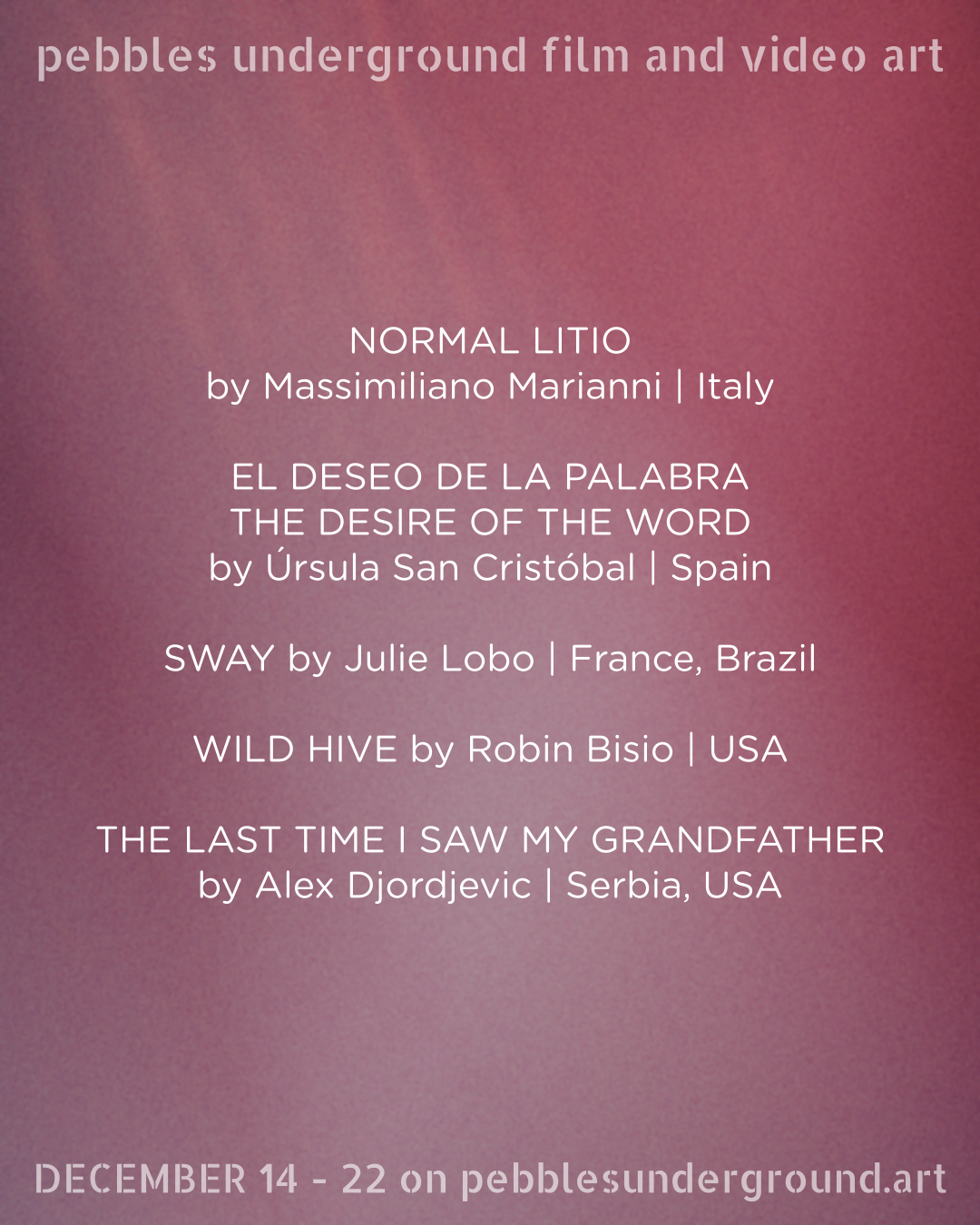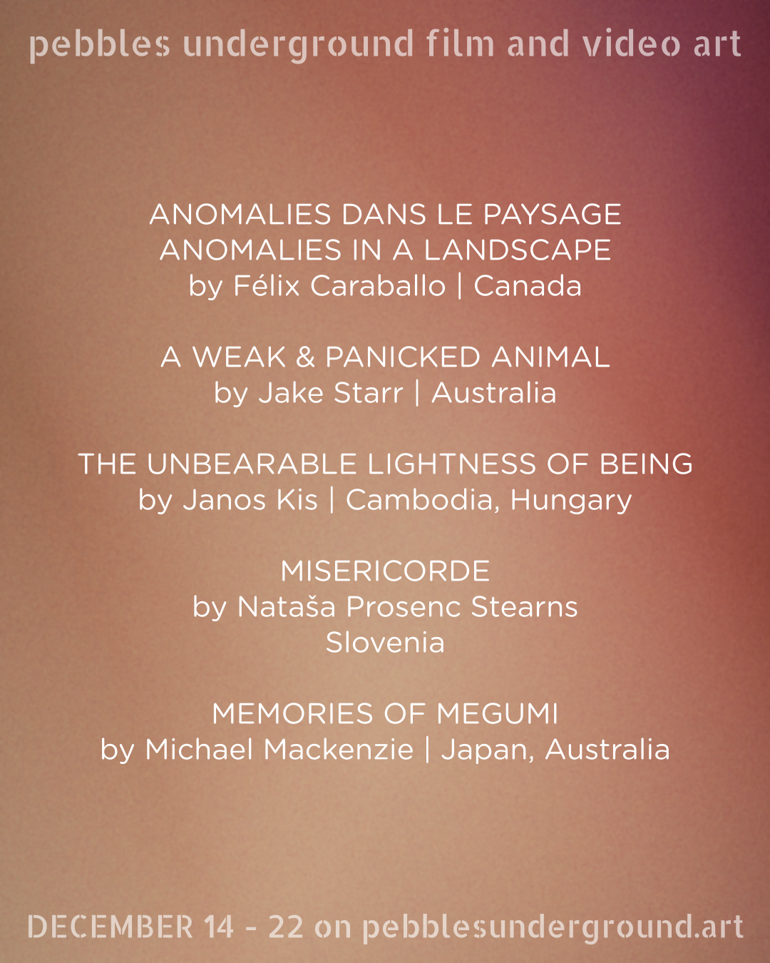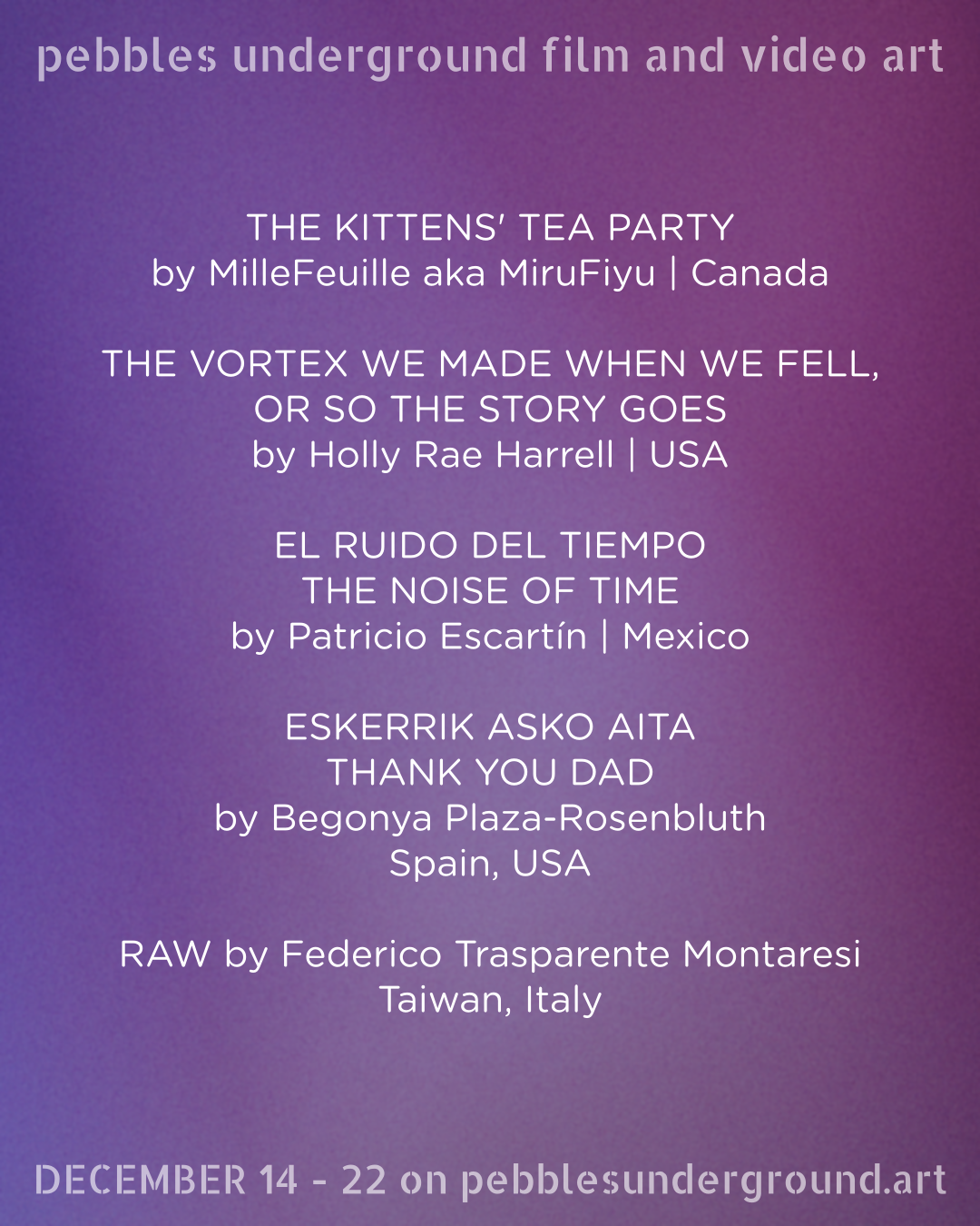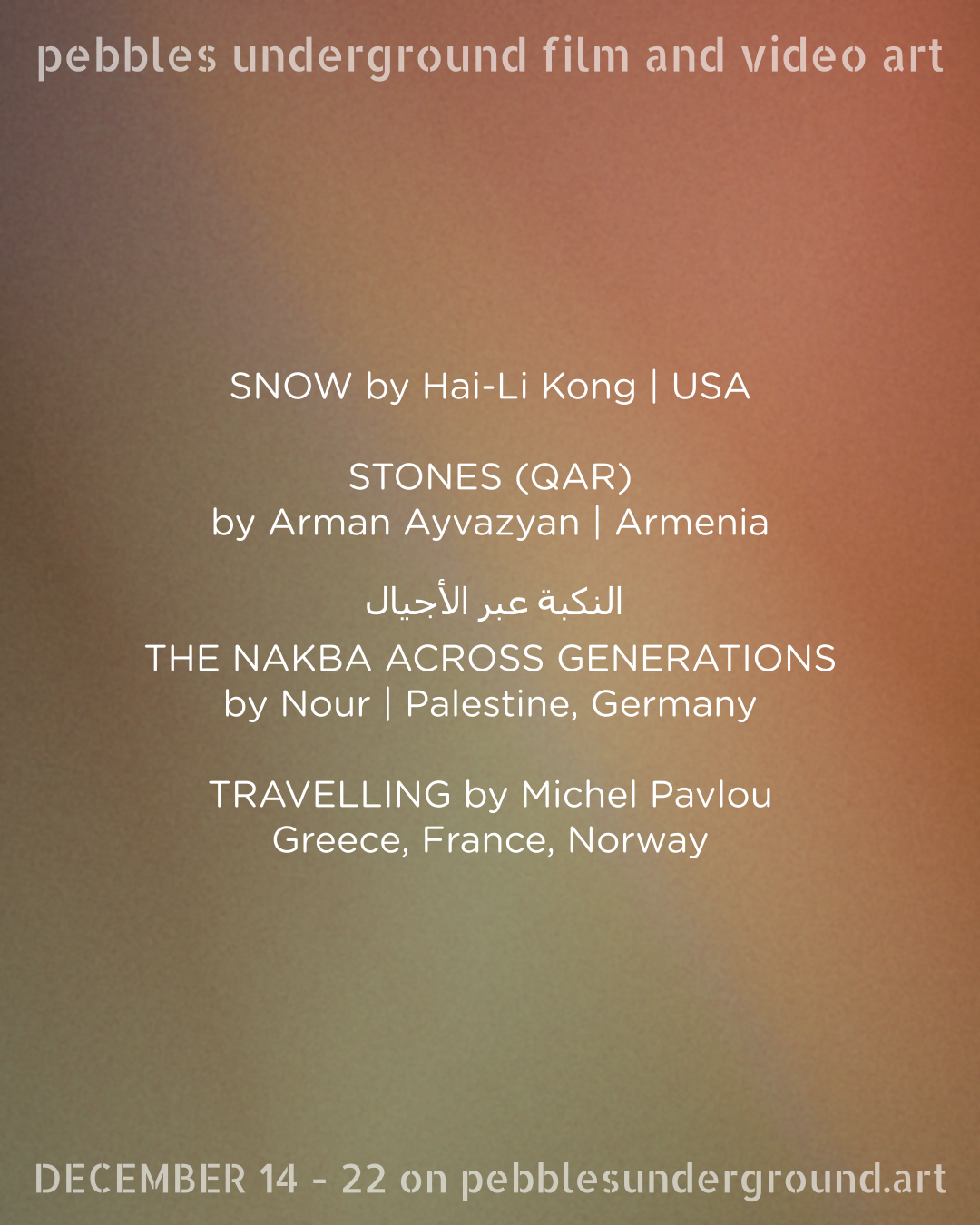 While our team is working hard to prepare the Winter 2025 screening on our website, take a look at the final official selection in our Winter 2025 edition comprising 58 films from 34 countries! On air December 14-22 on pebblesunderground.art, more info on programs coming soon!