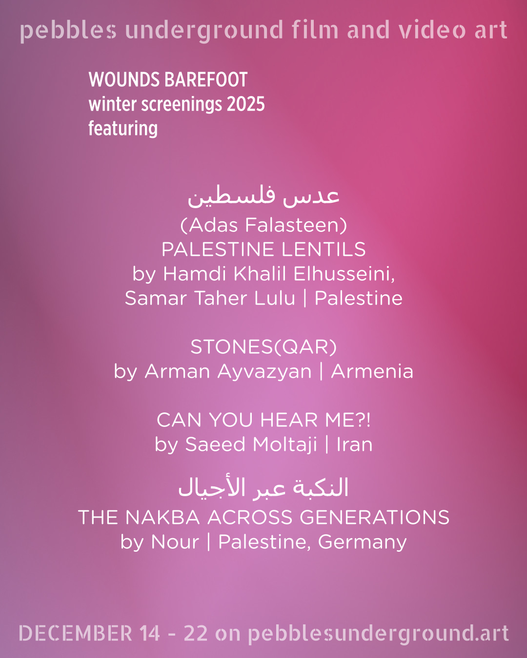 Winter Screenings 2025 feature experimental, surrealist, and underground cinema, documentaries of all types, essay films, screendance, video art, and animation. The programs resists fixed categories, moving fluidly between abstraction, documentary, and hybrid forms. This formal openness makes space for political urgency. Films from Palestine, Iran, Greece, South Korea, Uruguay, Armenia, Japan, the UK, the Americas, Australia, and across Europe engage questions of power, displacement, memory, and resistance through art itself.
